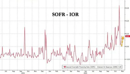 最新的动态是,作为关键融资成本基准的担保隔夜融资利率(SOFR)近期再度出现显著上行,其与美联储准备金利率(IOR)的利差已扩大至8个基点。这标志着此前趋于缓和的融资环境再度紧张。