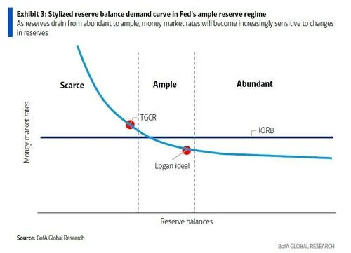 据高盛回购交易部门的分析,不仅是SOFR,三方回购利率(Tri-Party repo)近期也已反弹至准备金利率上方约0.8个基点。根据美国银行分析师Mark Cabana此前勾画的框架,这些利率指标高于IOR,通常意味着银行准备金已脱离“充裕”甚至“丰富”的水平,开始进入“稀缺”的区间。