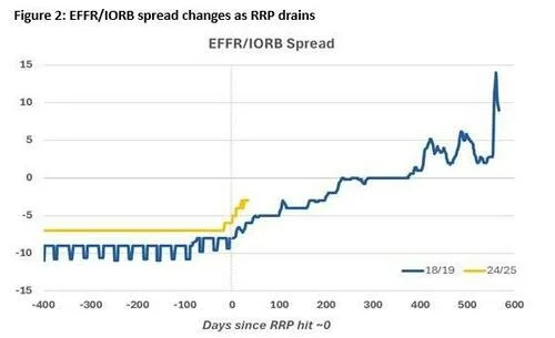 首先是有效联邦基金利率(EFFR)与准备金利率(IORB)的关系。回顾2018年至2019年的情况,当EFFR开始持续高于IORB时,美联储便决定放缓QT。Horvatin认为,当前市场正显现出明显的紧张态势,预计到年底EFFR与IORB的利差可能会进一步收窄。
