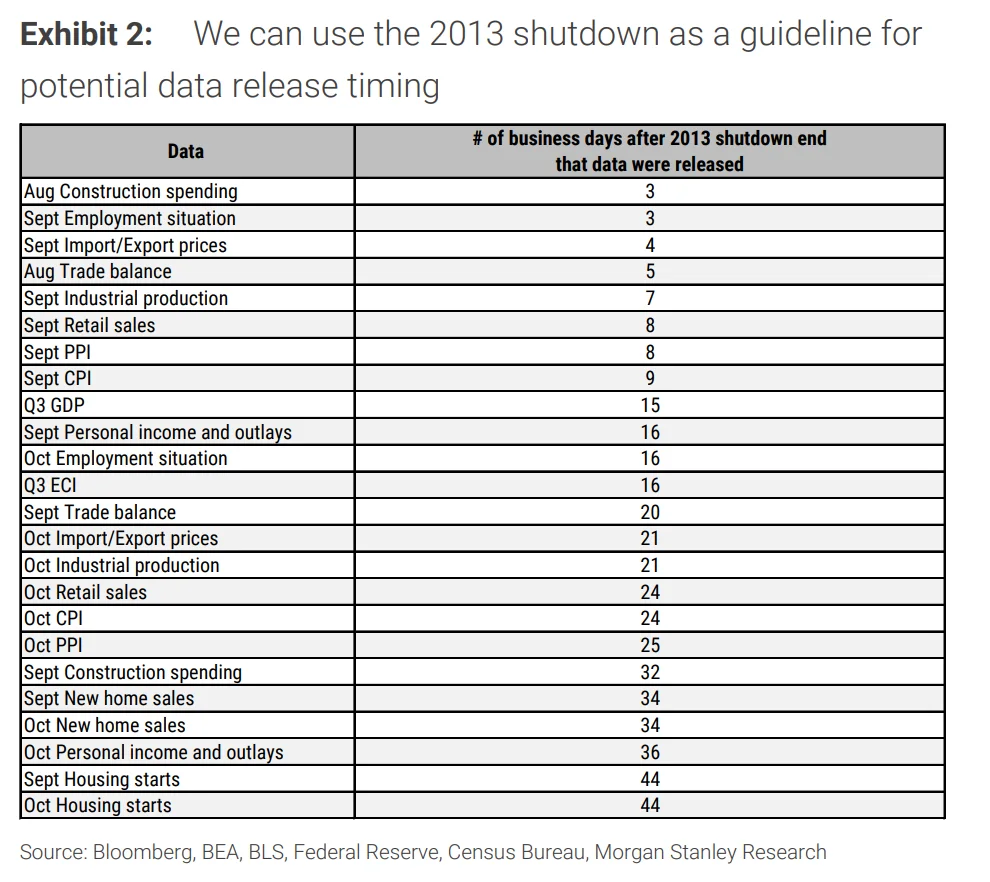 政府关门持续多久,直接决定了美联储决策的数据基础。摩根士丹利的研究报告对此进行了情景分析,该行经济学家Michael T Gapen的团队以2013年的政府关门事件为参照,预测了不同关门结束日期下,美联储可能获得的数据。