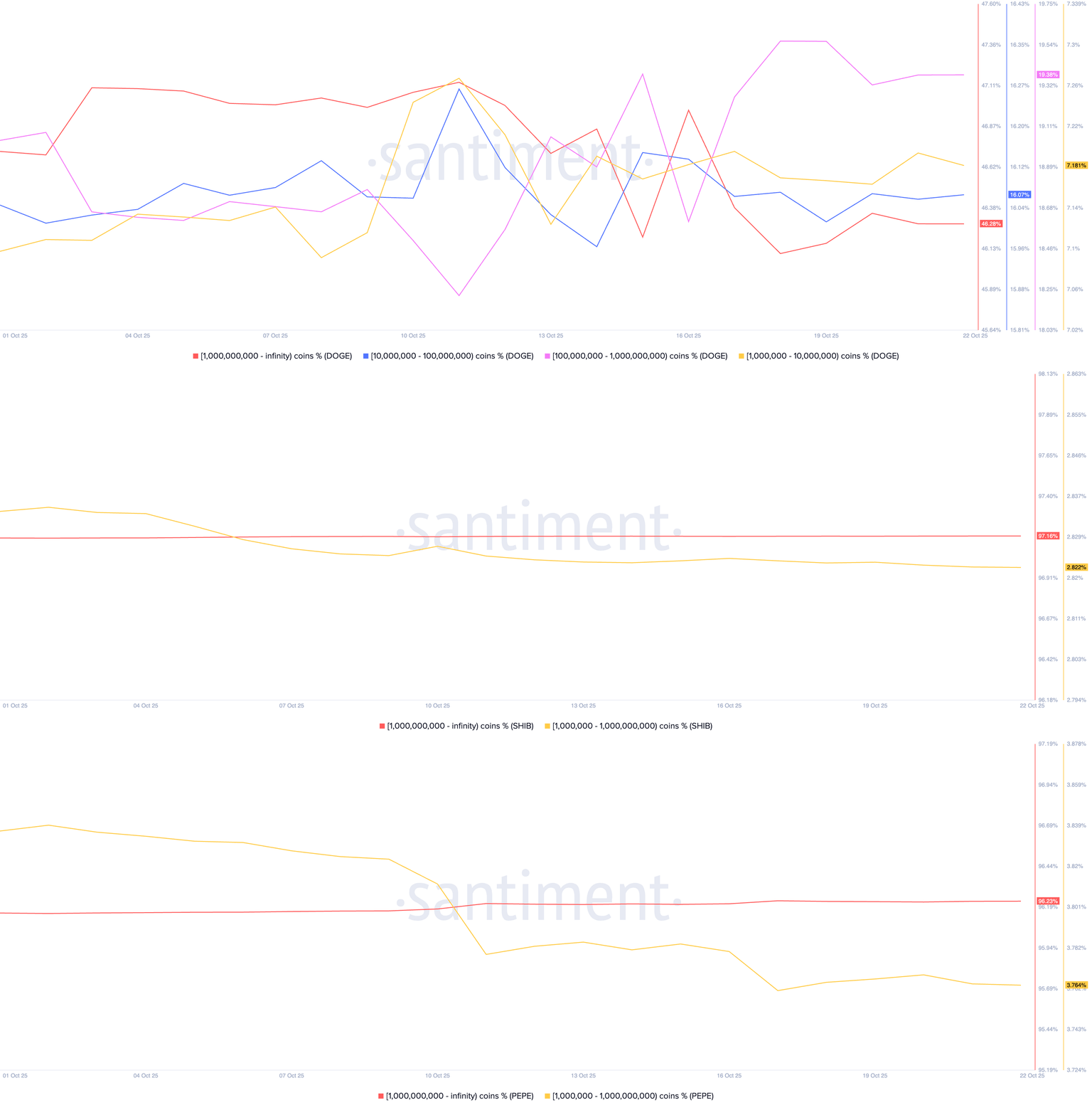 Santiment 数据显示,持有超过 10 亿枚 DOGE 代币的投资者已将其持有量从 10 月 1 日的 46.75% 降至可用供应量的 46.28%。