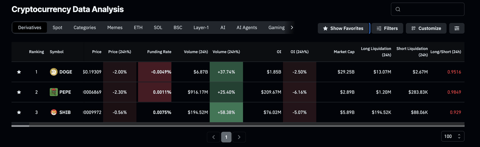 Meme 币衍生品数据。来源:CoinGlass