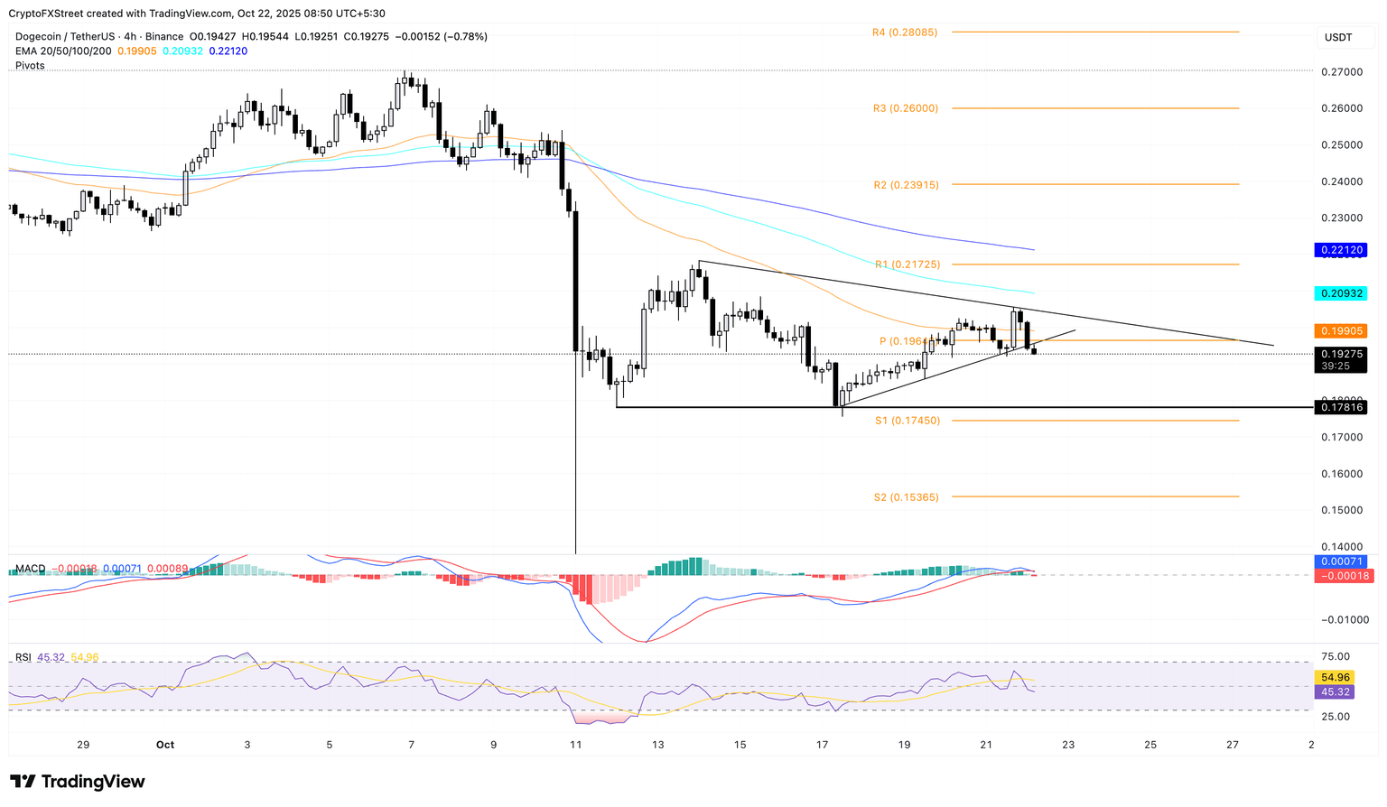 DOGE 的潜在反弹应该会超过周二的高点 0.2056 美元,以确认趋势线突破,目标可能是 R1 枢轴点水平 0.2172 美元。