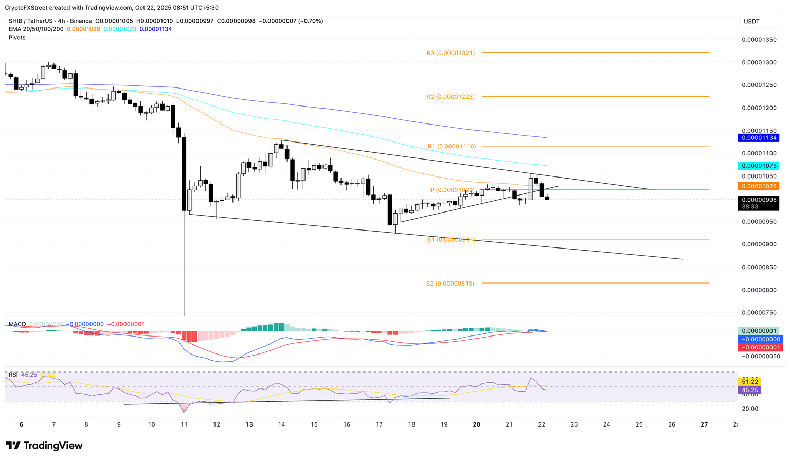 截至周三发稿时,Shiba Inu 的交易价格低于 0.00001000 美元的心理关口,有可能在 4 小时图上形成的下降通道内进入下行周期。SHIB 的直接支撑位位于 S1 枢轴点 0.00000911 美元,略高于下降通道的底部趋势线。