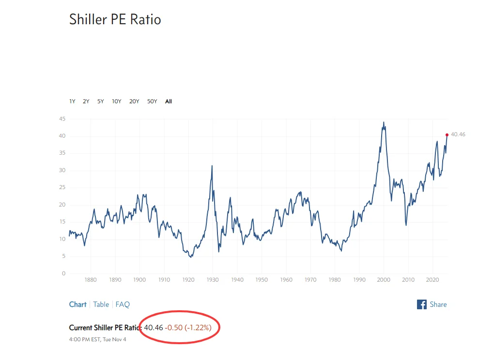 据《华尔街日报》最新报道,这项被称为“周期性调整市盈率”(CAPE或Shiller P/E)的指标近期已突破40大关。这是该指标有记录以来第二次达到如此高位,此前唯一一次是在1999年,即科技股泡沫的顶峰时期。这一动态为当前高歌猛进的美国股市敲响了警钟。