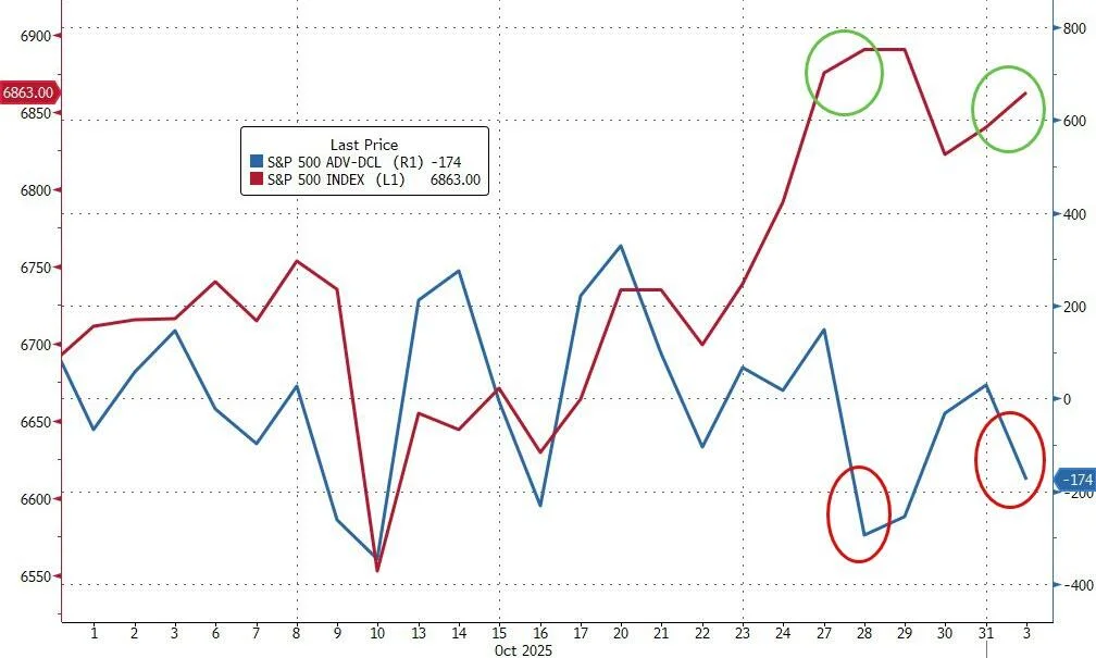 衡量市场健康状况的一个关键指标是“市场广度”,即参与上涨的股票数量。而当前,这一指标正在亮起红灯。