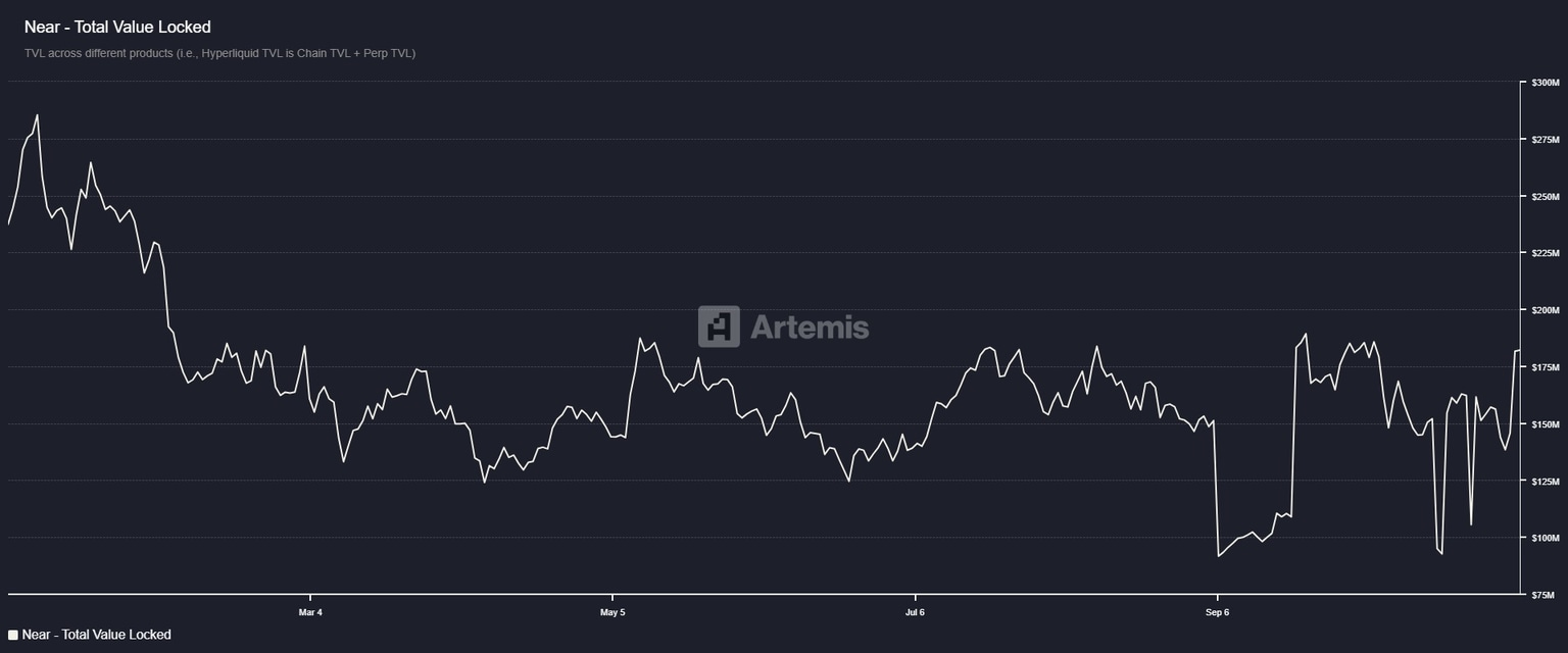 Arthemis Terminal 的数据显示,NEAR 的总锁定价值 (TVL) 于周三增至 1.821 亿美元,高于 10 月 29 日的 1.055 亿美元,并且此后一直稳步增长。TVL 的增长表明用户对 NEAR 协议生态系统的活跃度和兴趣日益增强,这意味着越来越多的用户正在基于 NEAR 的协议上存入或使用资产。