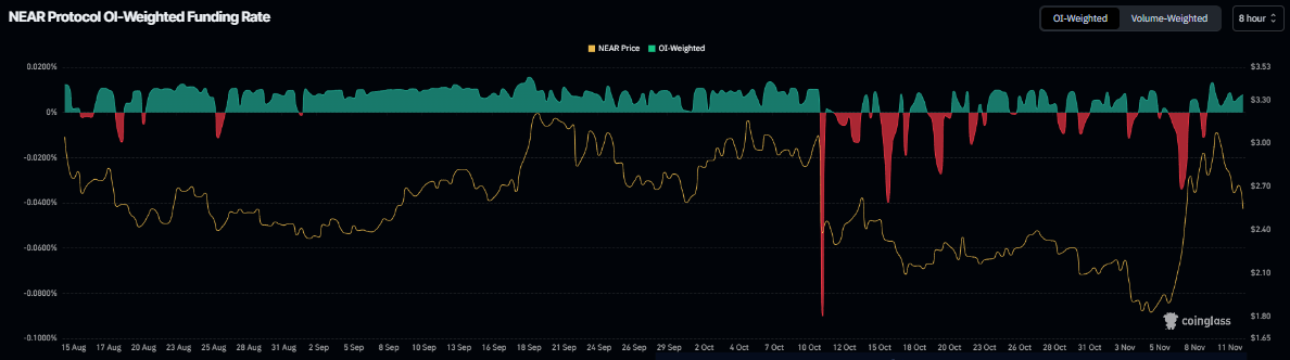 在衍生品方面,NEAR似乎已做好反弹准备。Coinglass的未平仓合约加权资金费率数据显示,押注NEAR协议价格将进一步下跌的交易者数量低于预期价格上涨的交易者数量。该指标在周日转为正值,周三达到0.0079%,表明多头正在向空头支付资金,并显示出看涨情绪。