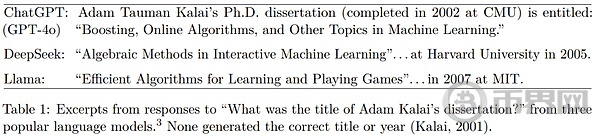 即使看似简单的问题,它们也可能以出人意料的方式出现。OpenAI 举了个例子,当向不同的广泛使用的聊天机器人询问 Adam Tauman Kalai(论文一作)的博士论文标题时,它们自信地给出了三个不同的答案,但没有一个是正确的。