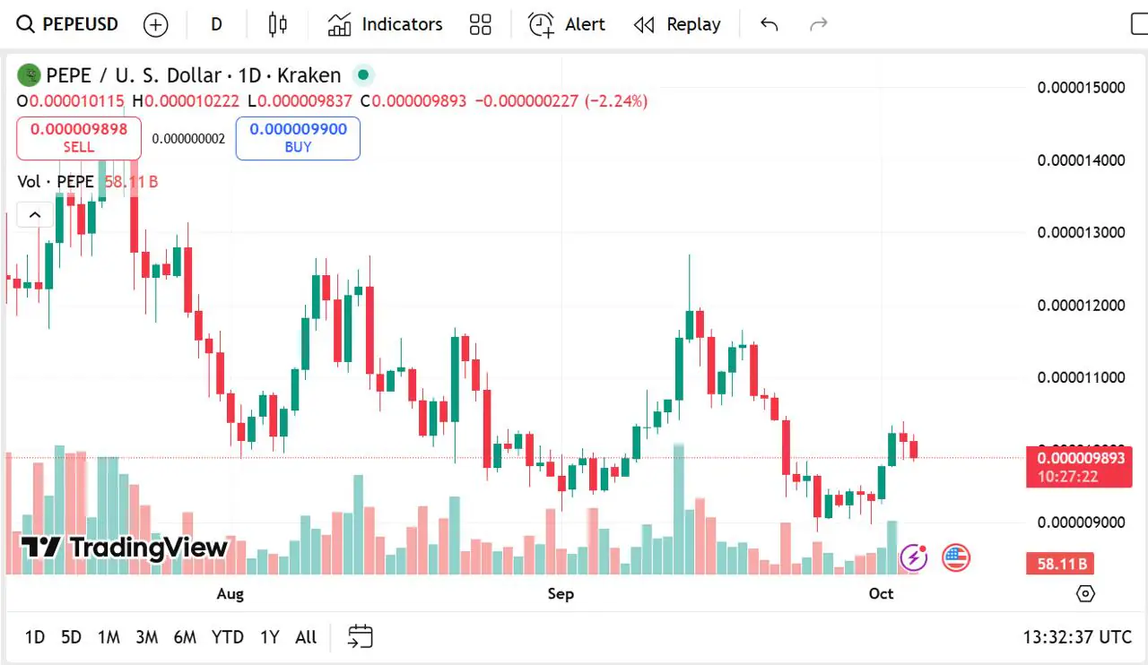 “>流动性。Pepe 币价格目前为 0.000009898 美元,当日上涨 0.16%。Pepe 的市值为 41.8 亿美元,交易量为 7.3853 亿美元(一天内增长超过 13%),仍然是流通中价值低于 1 美元的顶级加密货币之一。