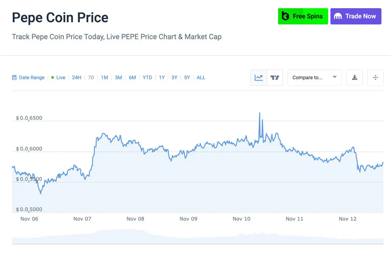 根据 Pepe Coin 价格图表,PEPE 目前的交易价格为$0.0₅584311月12日交易量超过5.13亿美元。过去一天,该网络迷因币下跌略低于1%,表明随着机构资金流入ETF认可的资产,其价格走弱。