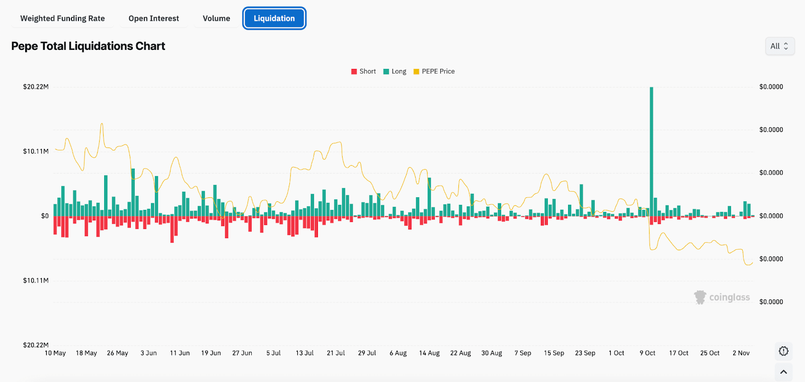 Pepe 的清算数据显示,过去六个月来,多头和空头头寸持续被清算,主要发生在价格快速波动期间。