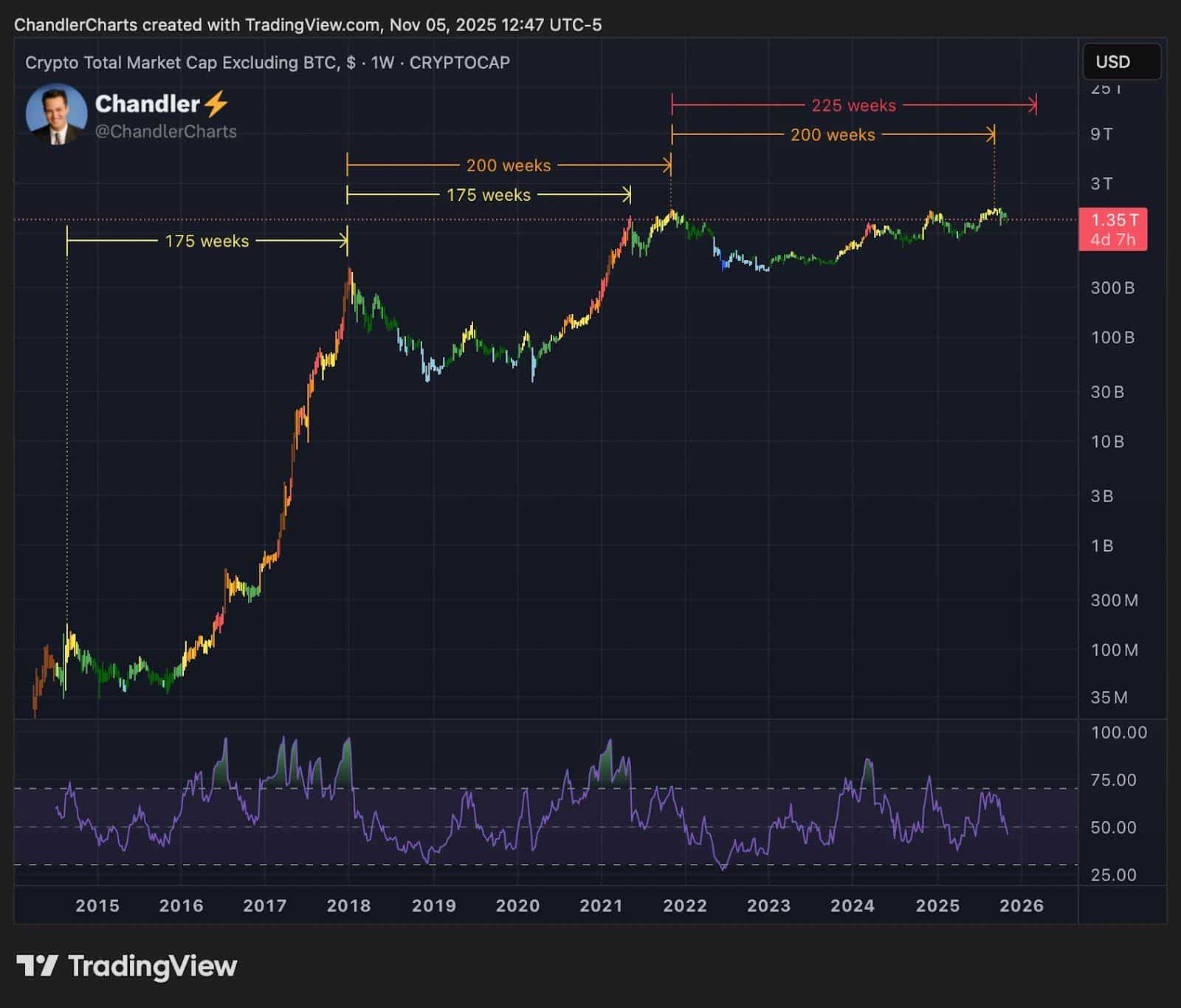 本周期目前已接近200周。即便如此,图表显示峰值可能持续到225周,这意味着未来可能出现更晚的峰值。