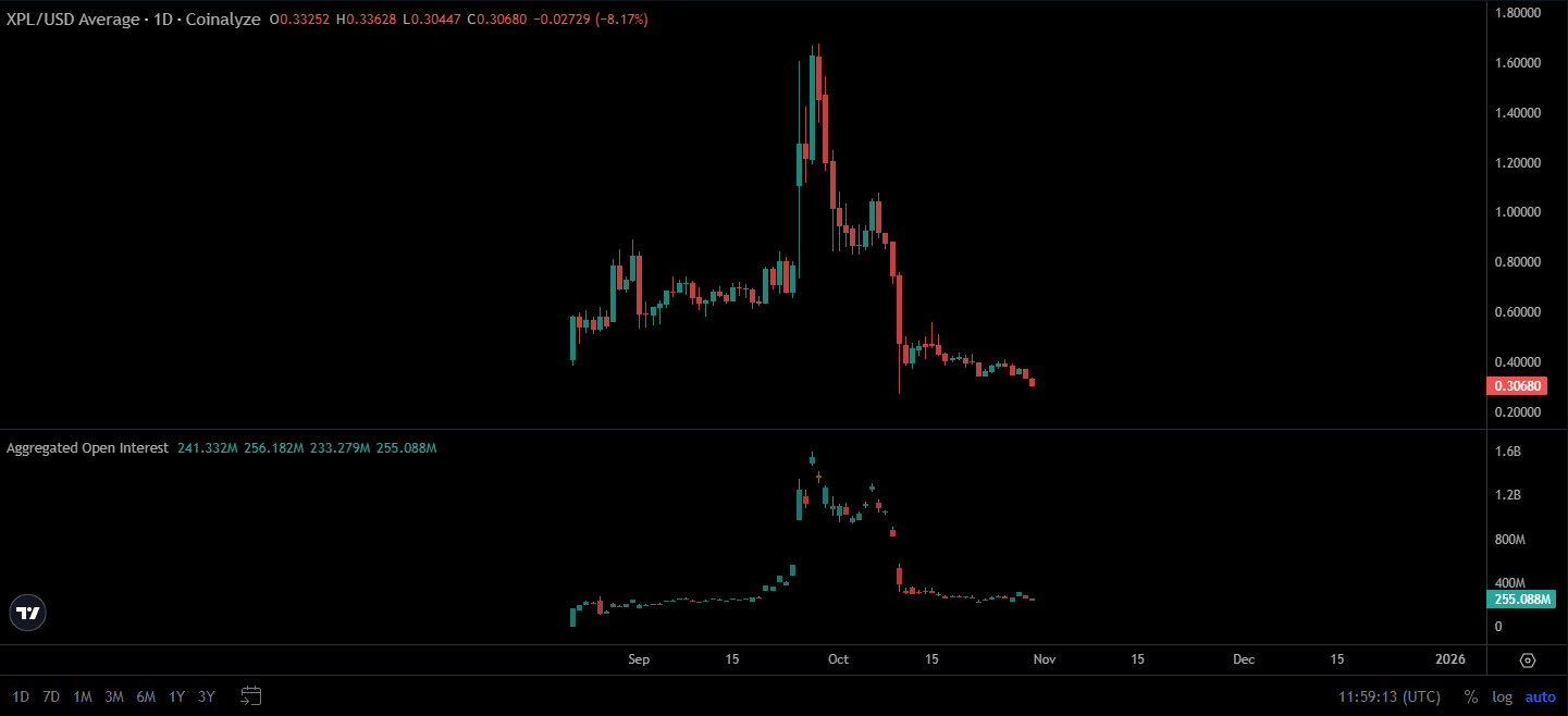 尽管股价大幅下跌,但Plasma的未平仓合约(OI)仍升至2.5508亿美元,高于此前约2.33亿美元的低点。通常情况下,当股价下跌时,由于交易员平仓,未平仓合约也会减少。