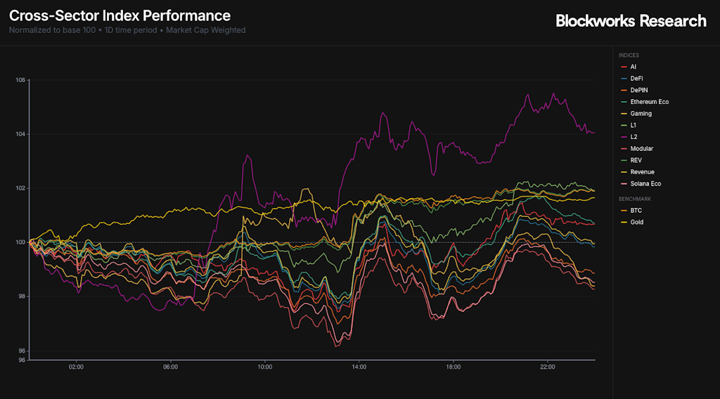 区间震荡的市场已从低点反弹。本周开盘全线上涨,股指和主要加密货币均走高。BTC 较近期低点上涨 5%,ETH 和 SOL 也延续了这一走势,分别较近期低点上涨 9% 和 11%。L2 类股是周一交易中的最大赢家,而 Modular 和 Gaming 类股则是当日最大输家。