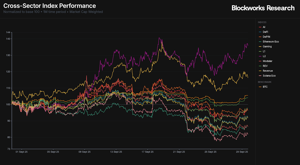 从月度时间范围来看,L2 仍然是显著的赢家。尽管 9 月份大多数指数均有所下跌,但 L2 却实现了 32% 的上涨。