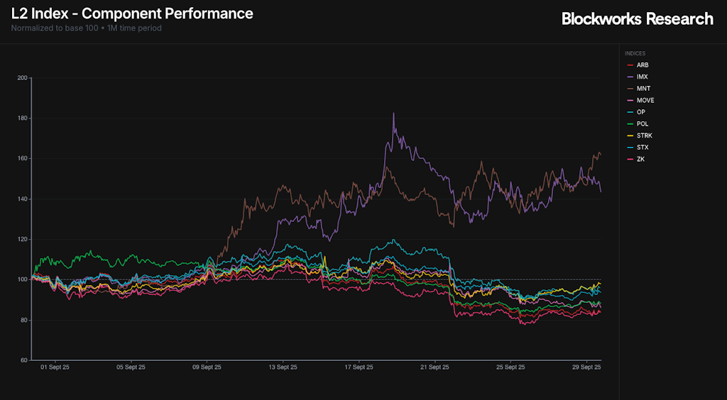 表面看来,该指数追踪的所有L2指数9月份均下跌,但MNT和IMX除外,分别上涨了62%和43%。尽管市场仍处于震荡区间,但部分阿尔法收益仍将持续存在。