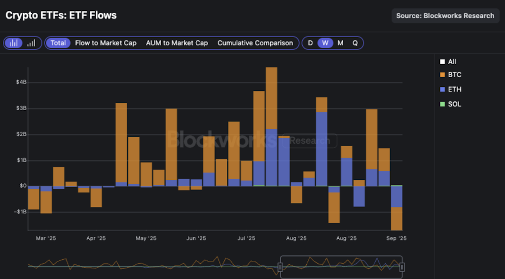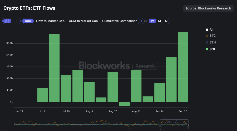相比之下,尽管上周遭遇抛售,SOL ETF 的净流入量却创下自成立以来的最高纪录,达到+5900万美元。这标志着 SOL ETF 连续五周实现净流入。根据《1933 年法案》批准的 SOL ETF 预计将在未来几周内获得批准,这可能会加速这一势头。再次强调,我们认为,根据《1933 年法案》批准的 SOL ETF 的资产管理规模(AUM)倍数可能会高于 REX-Osprey SSK 目前的水平。