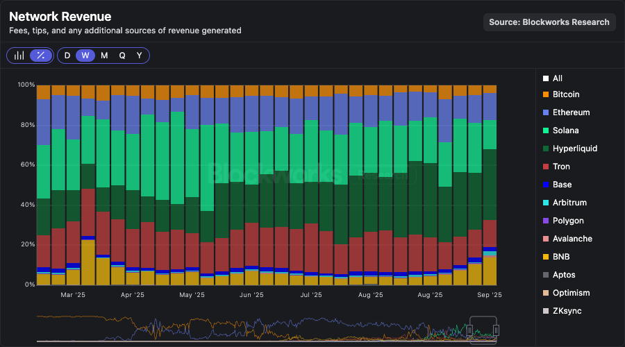 虽然我们对这些新的 SOL ETF 获批后流入资金持乐观态度,但 Solana 网络基本面的几个趋势仍然不容乐观。DEX 交易量、REV 和应用收入仍然低迷。此外,Solana 在网络收入方面的市场份额一直在稳步下滑,被 Hyperliquid 和 BNB 蚕食。这些 ETF 的新流入可能会继续支撑 SOL 的价格走势,但链上数据显示,这种活动在其他领域也日益活跃。