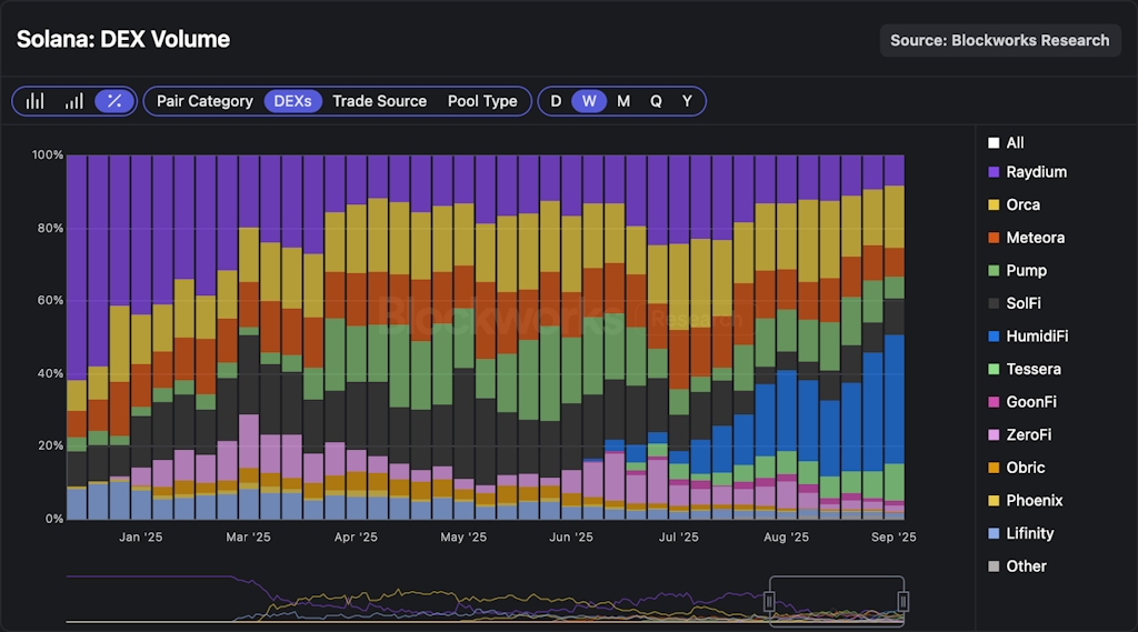 9月将是自营AMM(HumidiFi、SolFi等)在Solana DEX月交易量上首次超过传统AMM(Orca、Raydium等)的月份。SolFi于2024年10月推出时,所有自营AMM加起来仅占链上总交易量的7%。而本月,仅HumidiFi一项就占了DEX总交易量的28%。
