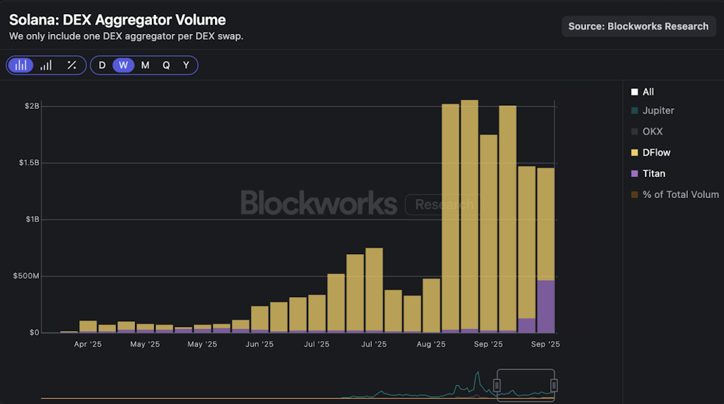 下图显示,自8月底以来,DFlow和Titan的交易量大幅增长,过去两周平均合计交易量约为15亿美元。需要注意的是,Titan最近的[激增]源于其9月18日的公开发布,团队报告称,其专有算法在87%的时间内优于竞争对手的定价。要使竞争减少的论点成立,所有聚合器都必须合谋维持相同的AMM集成,而实际上情况恰恰相反。聚合器实际上受到激励,会尽快集成新路由,以维持或提高其路由成功率。
