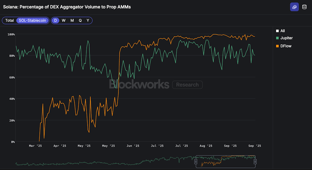 下图显示了 SOL-稳定币交易对中,DEX 聚合器交易量流向 AMM 的占比。我们观察到,DFlow 将 98% 的 SOL-稳定币交易量路由到 AMM,而 Jupiter 则为 80%。这种差异或许可以部分解释为什么 DFlow节拍木星在 SOL-USD 对的执行质量方面表现优异,尤其是对于较大规模的货币对。
