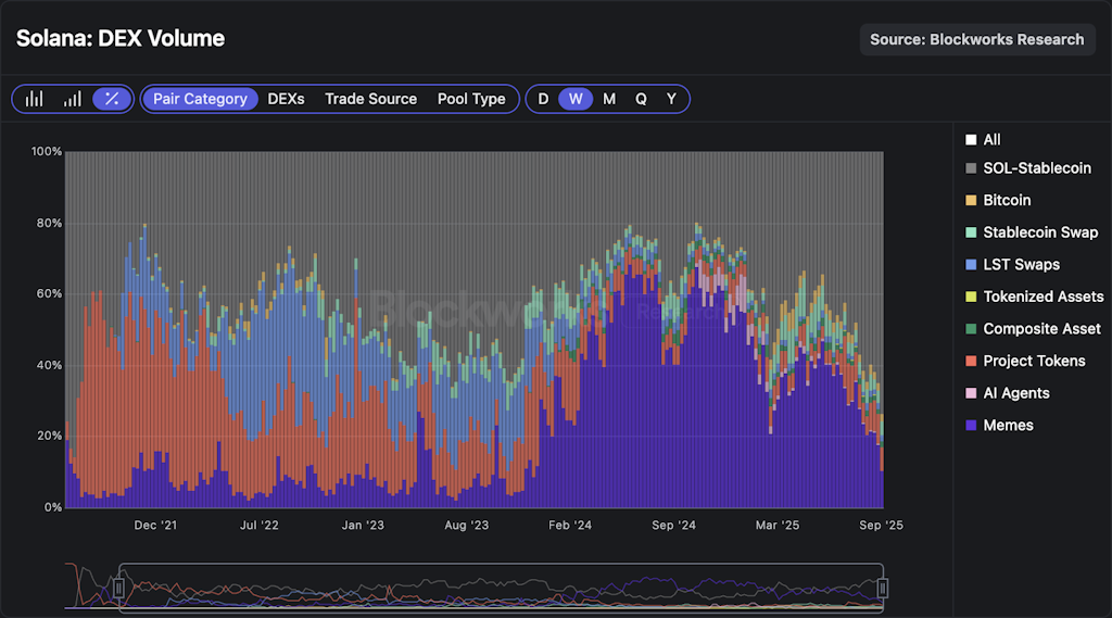 支柱型 AMM 的兴起是 Solana 上如今最有趣的事情之一,我认为我们仍在理解其全部含义。例如,上周 SOL 稳定币的交易量占链上 DEX 总交易量的 74%,这是我们四年多来从未见过的数字!与此同时,模因币 (memecoin) 的交易量急剧下降,上周市场份额为 10%,为 2023 年 12 月以来的最低水平。