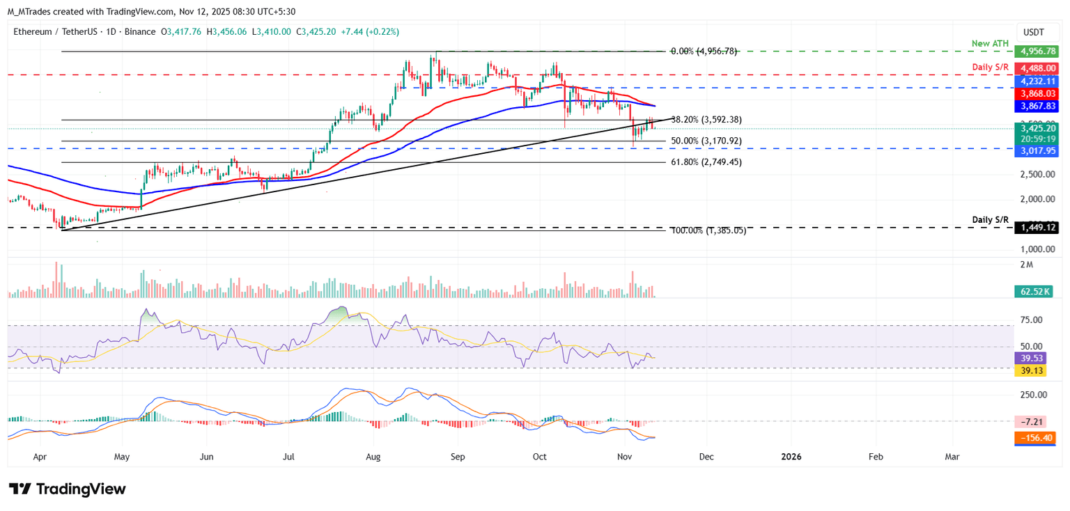 11月5日,以太坊价格在3171美元附近的50%回撤位获得支撑,并在周日之前反弹近5%。然而,周一以太坊在3592美元附近遭遇阻力,并在第二天下跌4.2%。截至周三发稿时,以太坊价格在3425美元附近徘徊。