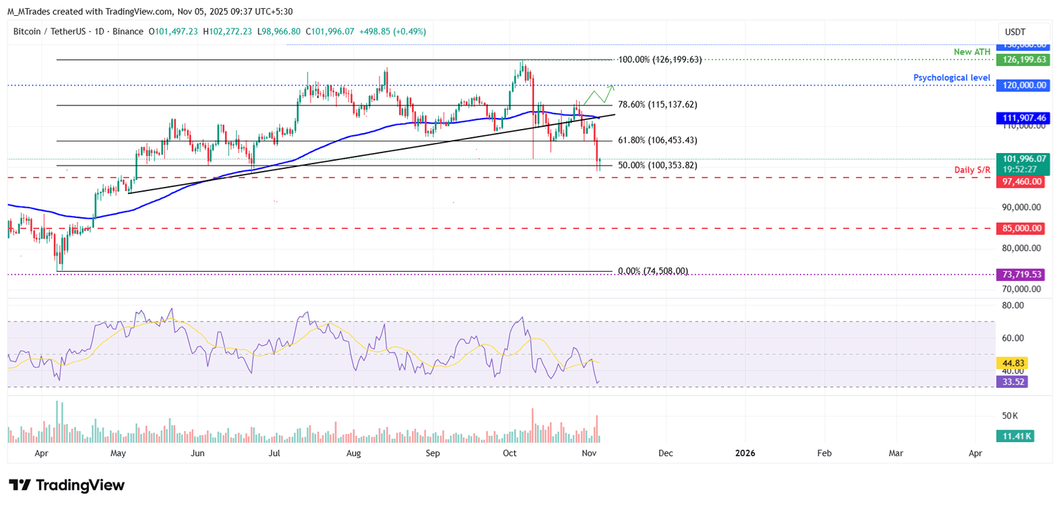 比特币价格周一,比特币价格在此前跌破的趋势线附近遭遇阻力,下跌8.18%,并在第二天回落,重新测试了100,353美元的50%回撤位。截至周三发稿时,比特币在100,353美元附近获得支撑,交易价格略高于102,000美元。