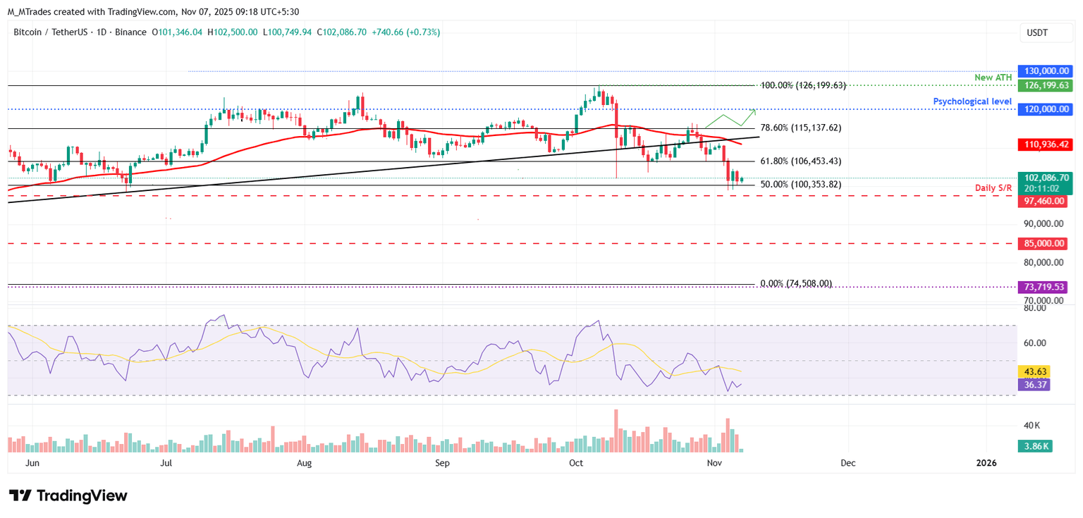 比特币价格周一,比特币价格在此前跌破的趋势线附近遭遇阻力,下跌8.18%,并在第二天重新测试了100,353美元的50%回撤位。然而,周三,比特币在100,353美元附近获得支撑后反弹2.35%,但大部分涨幅在第二天被抹去。截至周五发稿时,比特币价格在102,200美元附近徘徊。