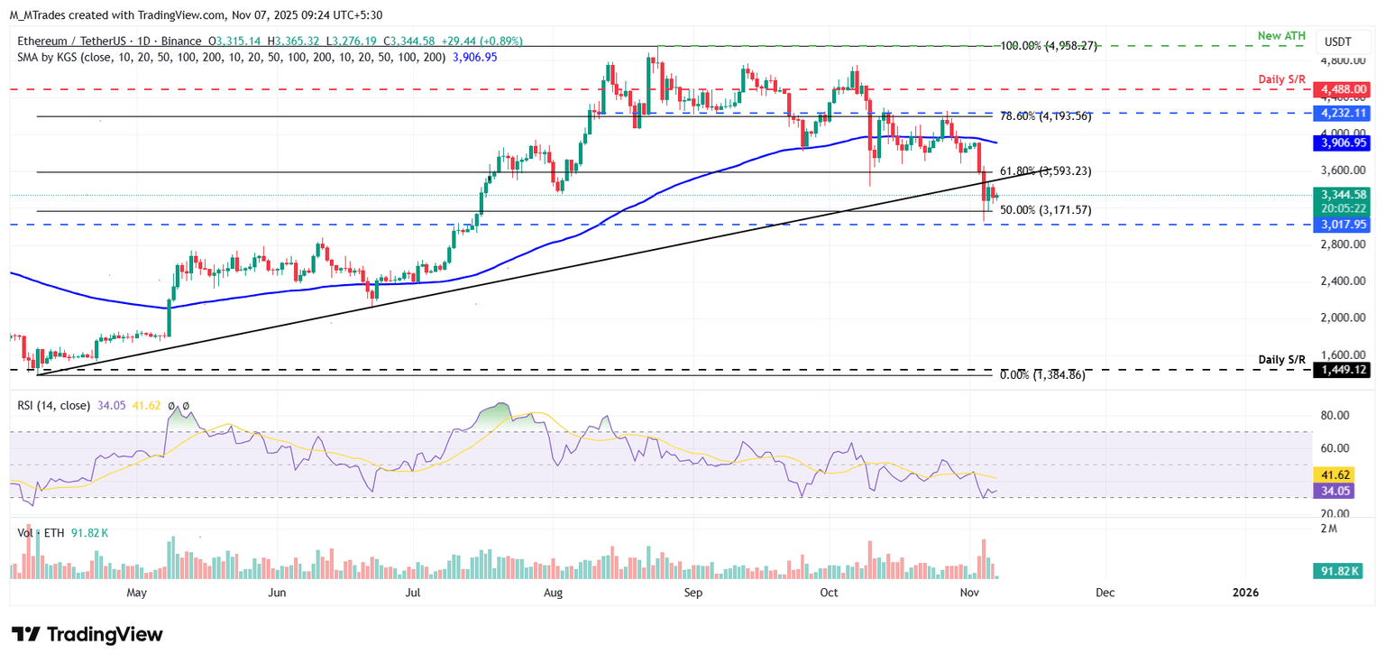 周一,以太坊价格在 3906 美元的 100 日均线附近遭遇阻力,随后在第二天下跌 15.73%,并重新测试了 3171 美元的 50% 回撤位。周三,以太坊价格小幅反弹,但在第二天再次在此前跌破的趋势线附近受阻。截至周五发稿时,以太坊价格在 3300 美元附近徘徊。
