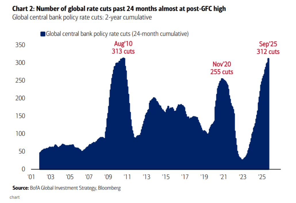 但如今,这一周期似乎已转向。这并不意味着全球宽松已经停止——美联储等主要央行仍有望进一步降息,而是指未来累计降息次数将有所减少。