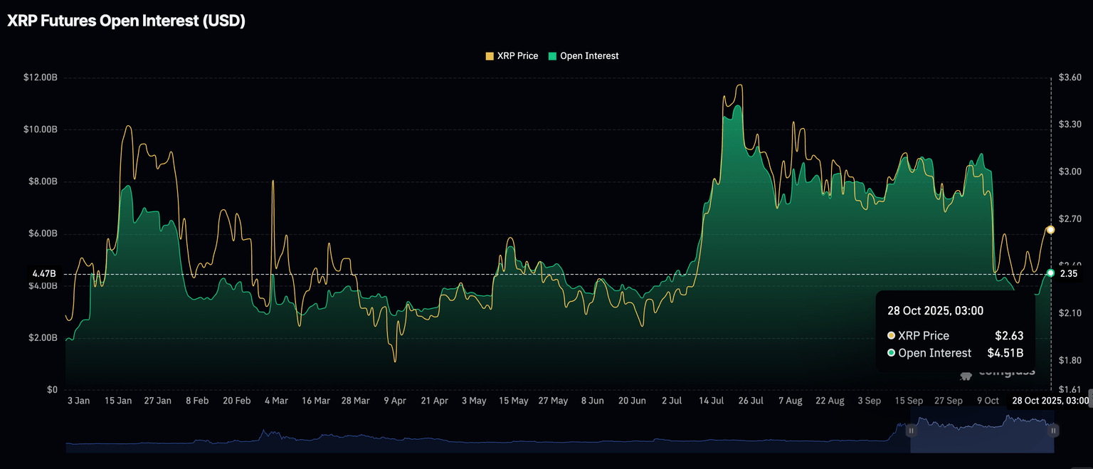 散户对 XRP 的兴趣正在升温,这从周二 XRP 期货未平仓合约(OI)的平均价值 45.1 亿美元可以看出。根据 CoinGlass 的数据,随着避险情绪在市场蔓延,追踪未平仓期货合约名义价值的 OI 在 10 月 19 日暴跌至 34.9 亿美元,为 4 月底以来的最低水平。加密货币在更广泛的宏观经济不确定性和中美贸易僵局的背景下,市场。