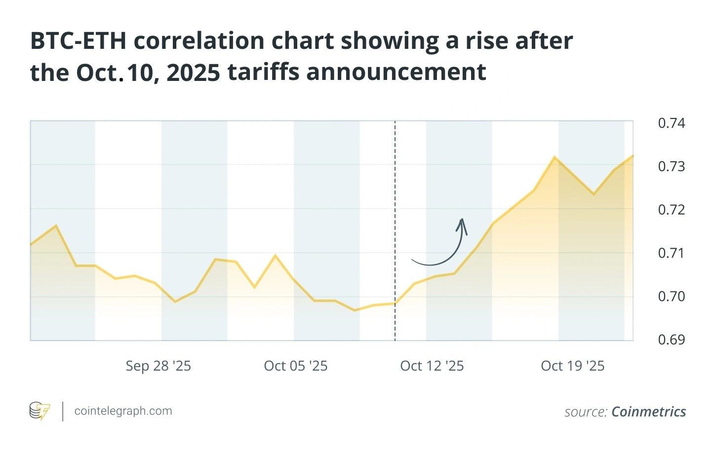 例如,在2025年10月10日关税公告发布后,加密货币市场经历了大规模的抛售潮,比特币价格大幅下跌。据CoinMetrics数据显示,在接下来的八天里,BTC与ETH的相关性从0.69上升至0.73,而BTC与XRP的相关性则从0.75上升至0.77。