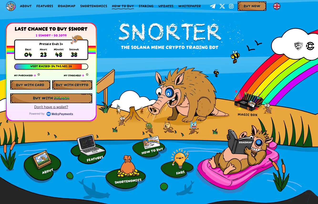 当你进入主页时,你会看到一个小部件,里面显示预售结束的倒计时。它还会向你展示几种购买 $SNORT 的方式。