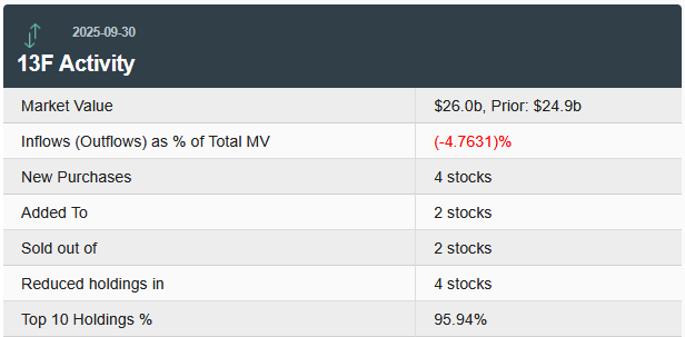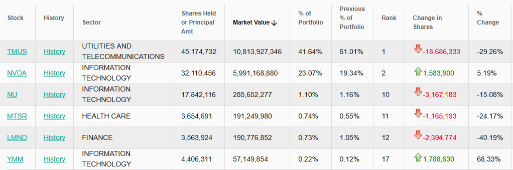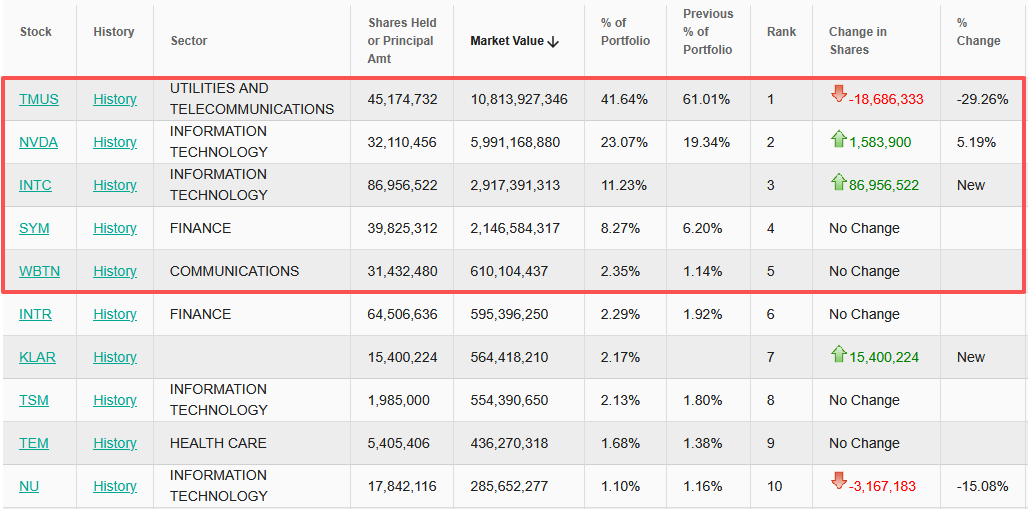 在前五大重仓股中, $T-Mobile US (TMUS.US)$ 位列第一,持仓约4517万股,持仓市值约为108亿美元,占投资组合比例为41.64%,持仓数量较上季度下降29.26%。