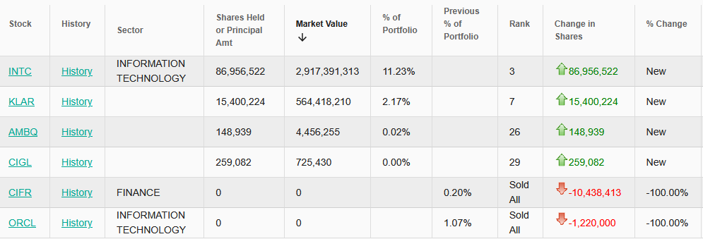$英特尔 (INTC.US)$ 位列第三,持仓约8696万股,持仓市值约29亿美元,占投资组合比例为11.23%。英特尔为软银三季度新建持仓。智通财经APP曾报道,2025 年 8 月,软银与英特尔签署了一份证券购买协议,软银以每股 23 美元 的价格购买英特尔普通股,投资总额约为 20 亿美元,完成该交易后,软银大约持有英特尔 2% 的股份。根据公开资料,这让软银成为英特尔的第五大股东之一。