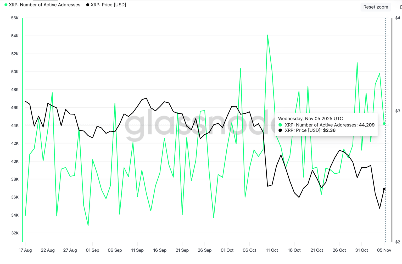 XRP 账本 (XRP) 的链上活动显著下降,每日独立地址数从 10 月 10 日的 44,000 个降至周三的约 54,000 个。此次 18.5% 的跌幅,恰逢价格从 2.84 美元暴跌至 2.30 美元左右,表明用户参与度降低。换言之,投资者并不认为 XRP 已经触底,正在撤离市场。