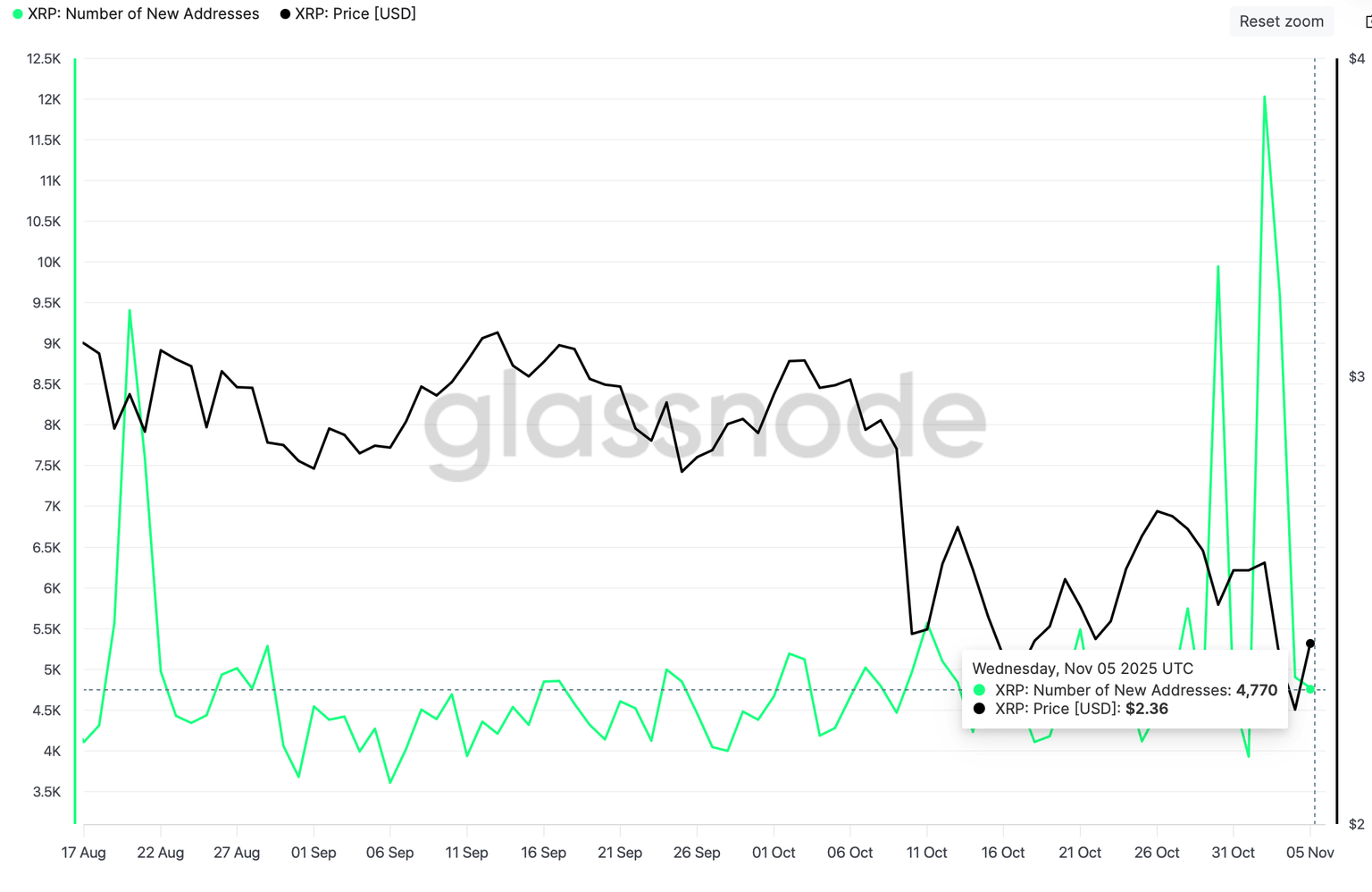 XRPL 上新增地址的数量波动较大,出现峰值后紧接着短暂回落。Glassnode 的数据显示,截至周三,新增地址数量已从周日的约 12,000 个下降了 60%,至 4,770 个。