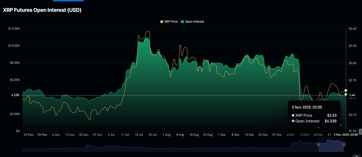 XRP 的技术结构正在走弱,而零售需求的疲软加剧了这一趋势。根据 CoinGlass 的数据,截至发稿时,XRP 的未平仓合约量 (OI)(代表未平仓期货合约的名义价值)平均为 43.3 亿美元,低于 10 月份创下的 90.9 亿美元的峰值。