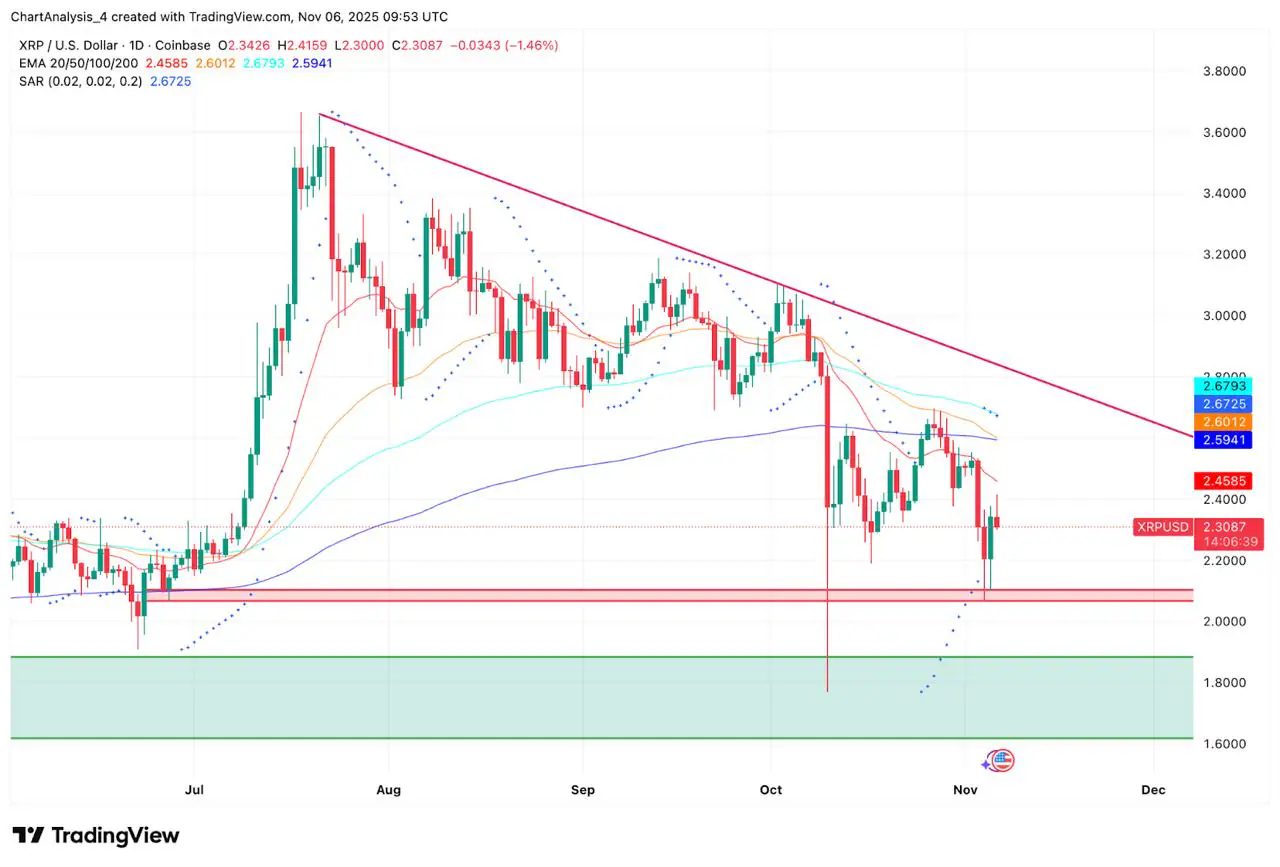 XRP 目前交易价格低于 20 日、50 日和 100 日均线,这些均线在 2.60 美元至 2.67 美元附近构成阻力。此前每次反弹至该区域后均遭遇抛售,表明市场情绪依然疲软。2.20 美元目前是关键支撑位,阻止了价格进一步下跌至 1.80 美元区域。分析师表示,若 XRP 能有效收于 2.60 美元上方,则可能扭转颓势,买方力量重新占据主导地位,而 3.00 美元则成为潜在突破的关键上行目标。