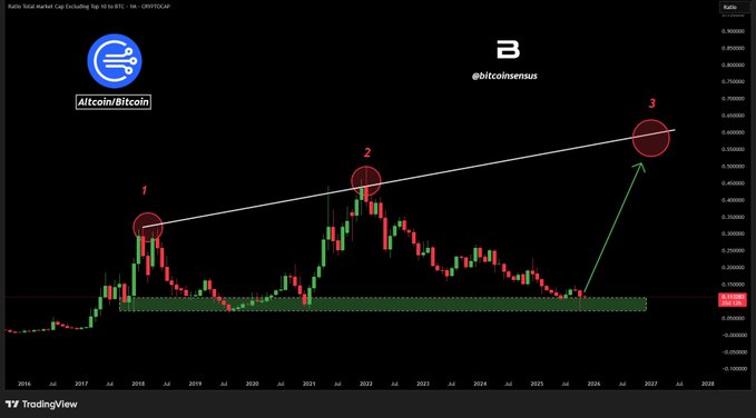 山寨币/比特币比率在历史支撑区域反弹,该区域在之前的市场周期中一直是山寨币行情的坚实基础。