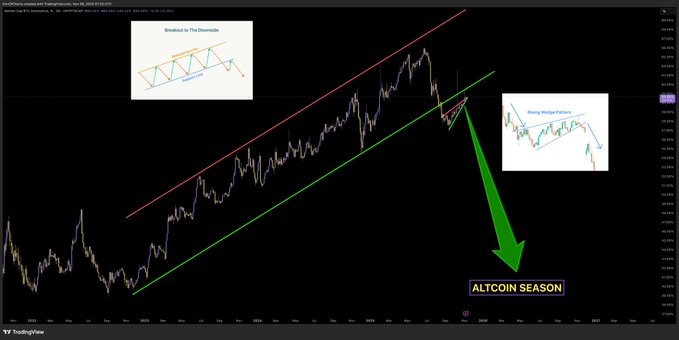 比特币的主导地位刚刚突破了上升楔形形态,这标志着山寨币季的开始。