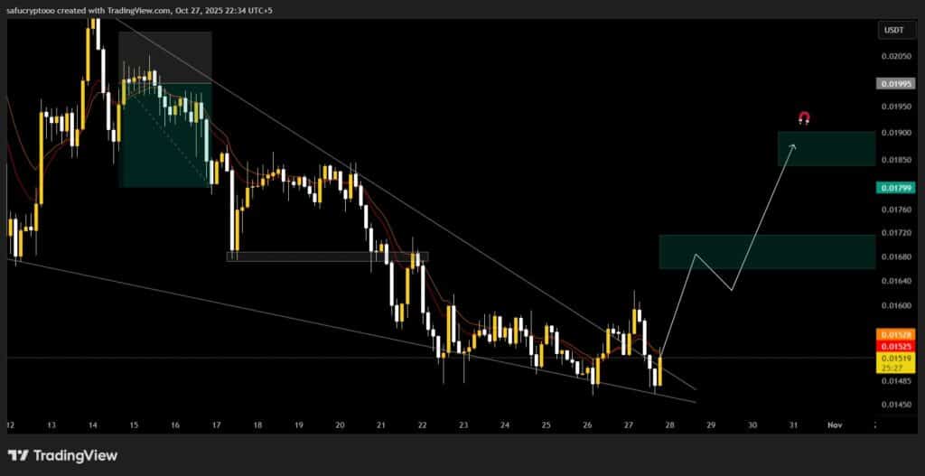 Linea 的图表在稳步下跌趋势后形成了一个干净的下降楔形,这种形态通常预示着看涨反转。价格一直在楔形线之间波动,刚刚再次触及下行趋势线,这表明买家正在低点入场。