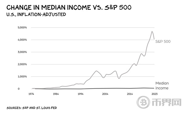 2024 年 4 月,纽约大学斯特恩商学院教授 Scott Galloway 发表了一篇名为《对年轻人的战争<War on the Young>》的文章。其中写道从 1974 年到 2024 年,美国实际工资中位数增长了 40%,同期标准普尔 500 指数上涨了 4,000%。整整一百倍差距。