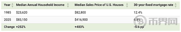 1985年和2025年美国收入、房价与贷款利率中位数对比|图源:Visual Capitalist