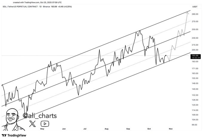 这种结构表明强大的技术纪律市场呈现上涨势头,买家在可预测的区间入场。目前,$SOL 正在通道中段支撑位附近盘整,区间在 190 美元至 200 美元之间。