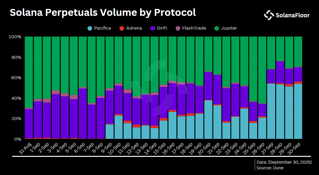 由于交易量增加,截至 9 月 27 日,Pacifica 在 Solana 永续债券交易中的份额攀升至 54%。与此同时,木星跌破 30% 且漂移跌至 14% 以下。这一变化凸显了 Solana 的永续债市场中市场份额的变化速度之快,但现在判断 Pacifica 在费用水平恢复正常后能否维持这一地位还为时过早。