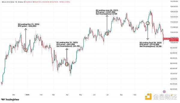 3月份比特币价格跌破8.5万美元时,该公司遭受损失;随后在第二季度和第三季度扭亏为盈,比特币分别于6月30日和9月30日收于10.7万美元和11.4万美元以上。如今,该公司的运营与比特币的价格周期完全同步,持续买入,但从不卖出。