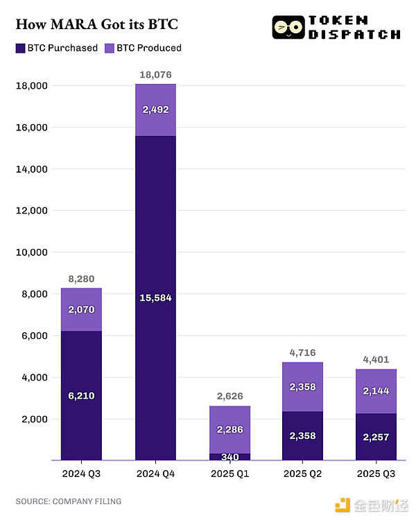 与 Strategy 不同,Marathon 通过挖矿和公开市场购买两种方式获取比特币。2025 年第三季度,Marathon 挖出了 2,144 枚比特币,并从市场上购买了 2,257 枚比特币。